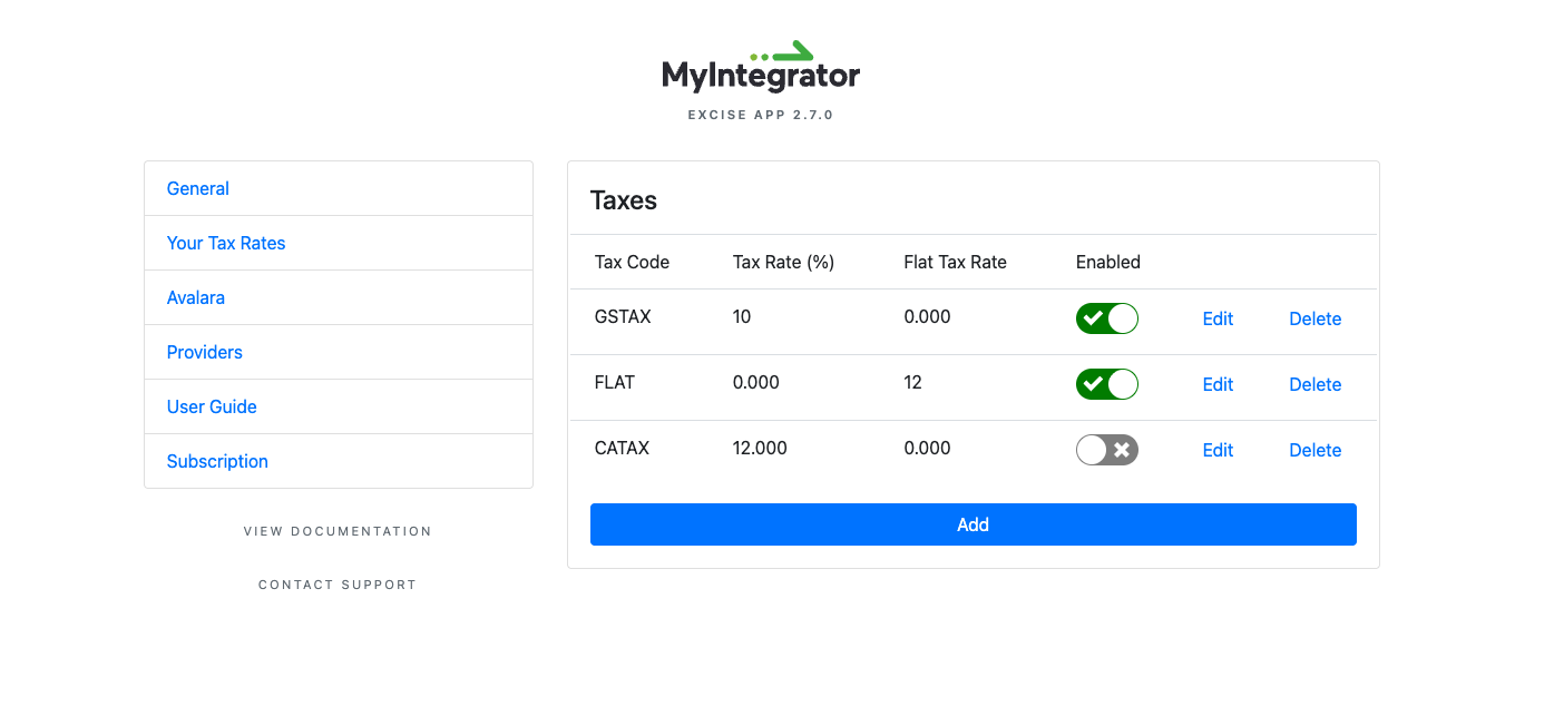 Note that if 'Include BigCommerce Basic Taxes' is enabled, the app's taxes will be returned in addition to the taxes set up in your store's BigCommerce settings. In the event of a collision between the two types of taxes (e.g. BigCommerce returns a 10% rate called 'State Tax', and the MyIntegrator app returns a 12% rate called 'State Tax', only the MyIntegrator tax rate will be returned).