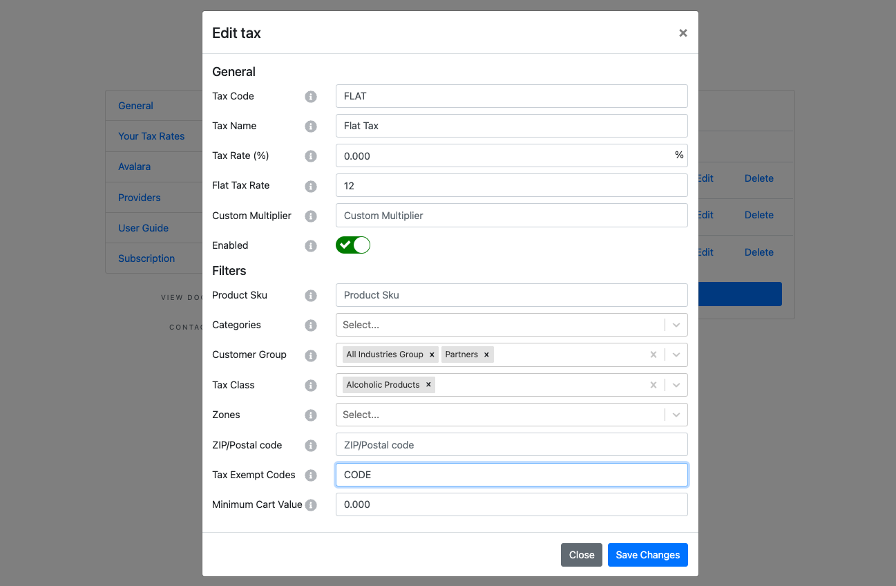 Important: All filter fields are optional. If a field is left blank, it has no effect and the tax will apply regardless of that criteria. Only fields with values will restrict when the tax applies.